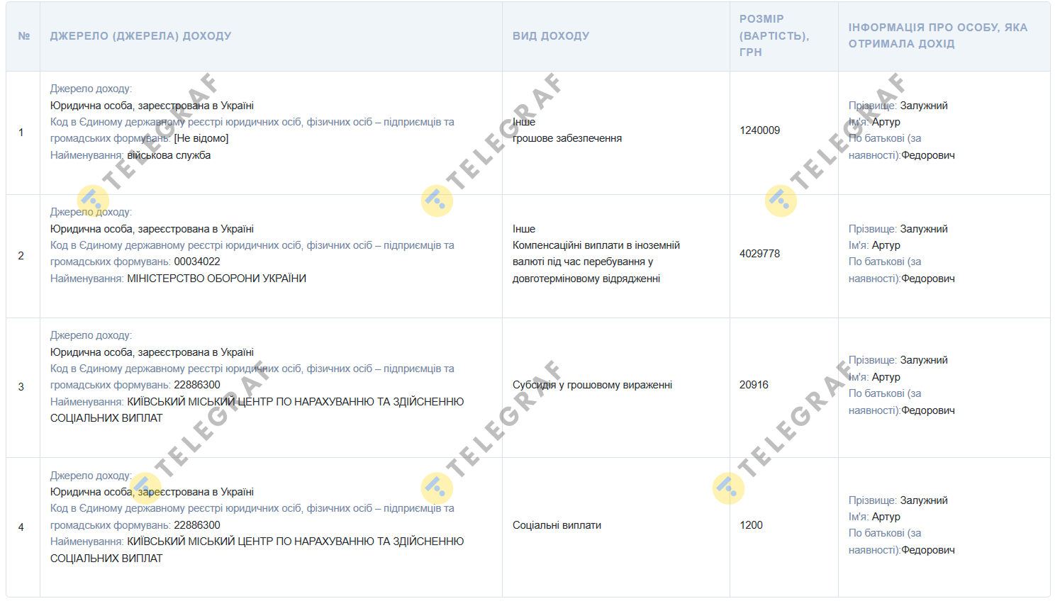 Дані про доходи Артура Залужного
