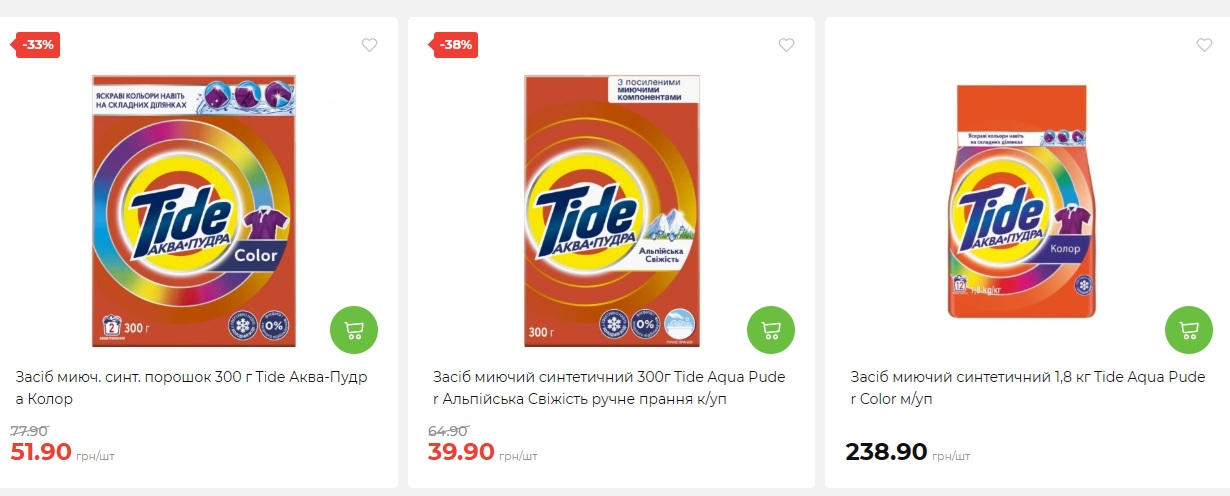 - Порошок Tide (Аква-пудра) 300г коштує 43 гривні замість 64 (~143 гривні за кг продукту)