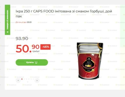 Йдеться про імітовану ікру горбуші від бренду CAPS FOOD у зручному форматі дой-пак (250 г). Якщо раніше за таку упаковку доводилося віддавати майже 94 гривні, то зараз ціна впала практично вдвічі.