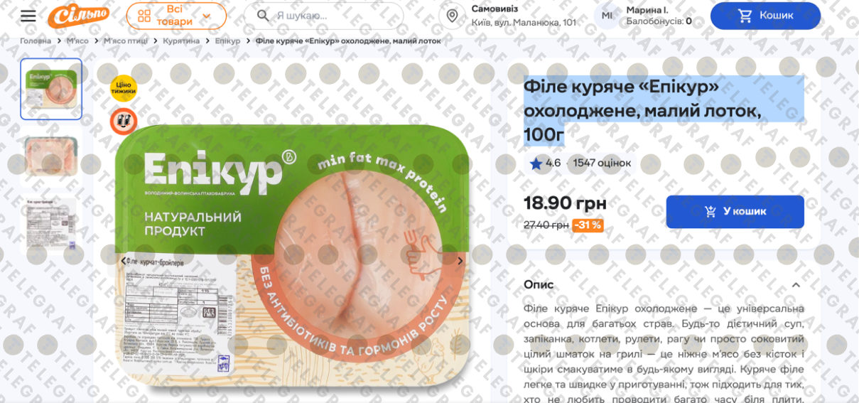 Наразі в онлайн-магазині та на полицях супермаркетів вартість філе становить лише 189 грн за кг. Попередня ціна без знижки складала 270,40 грн за кг. Покупець отримує знижку у розмірі 31%.