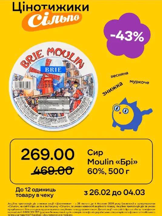Зокрема знижка в 43 % діє на популярний сир Moulin "Брі" 60 % вагою в 500 грамів.