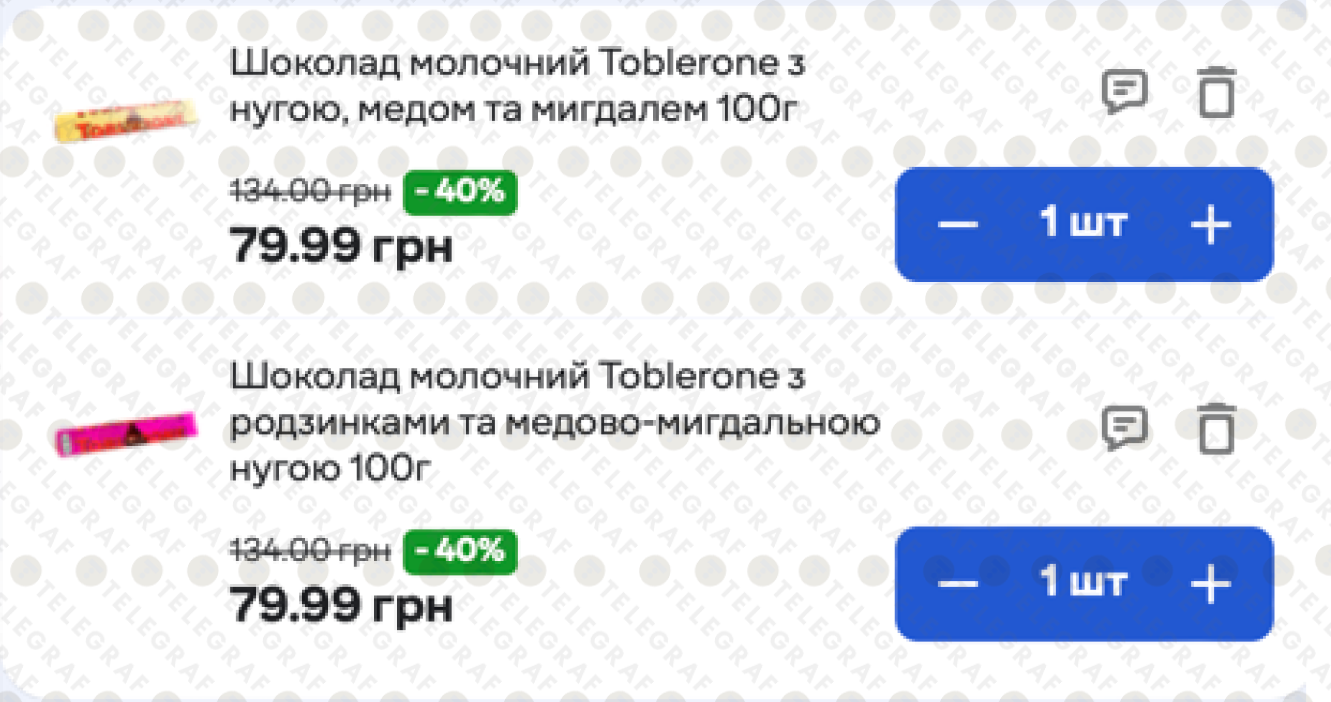 Згідно з даними мережі "Сільпо", вартість 100-грамової плитки Toblerone знизилася на 40%. Зокрема, акційна пропозиція діє на такі позиції: