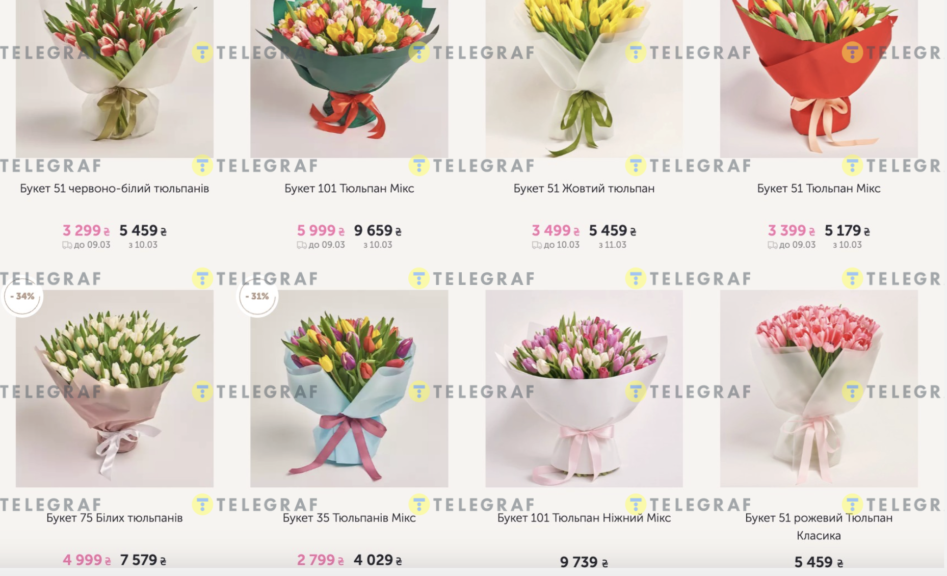 У Львові на одному з квіткових онлайн-сервісів можна побачити, наскільки швидко зростуть ціни на букети перед святом. Популярні композиції з тюльпанів, троянд або гіацинтів коштують від 2049 до 3169 гривень. Варто зазначити, що з 5-6 березня ціни можуть зрости майже вдвічі. Середній цінник у Львові для популярних букетів оцінюється приблизно у 2600 гривень.