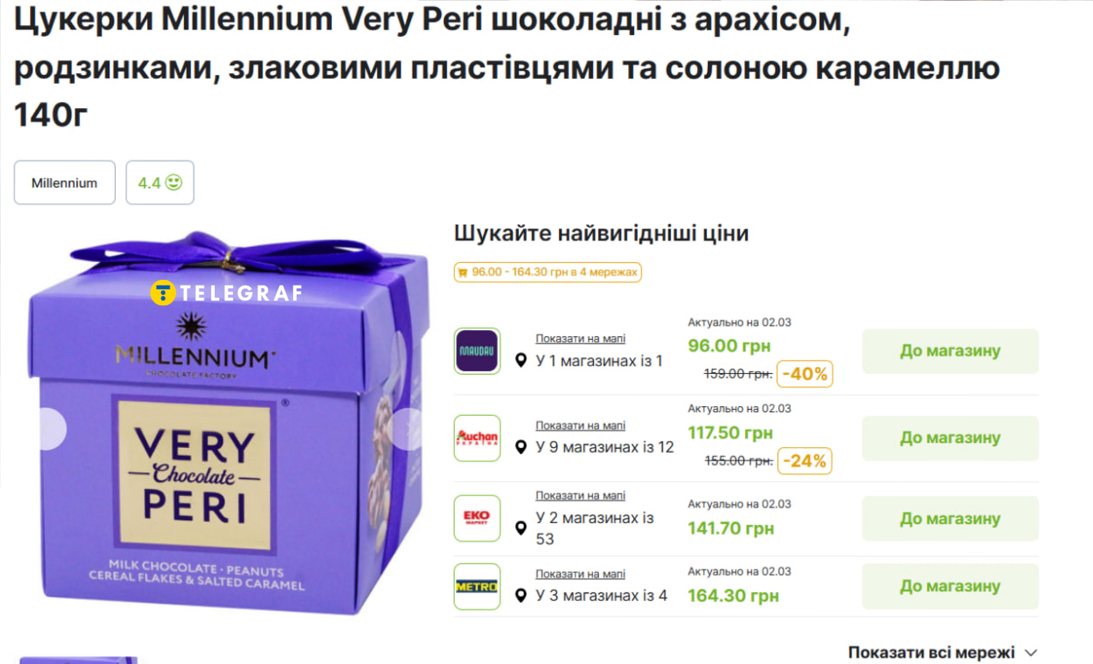 Ще один варіант — "Millennium Very Peri" (140 г) з арахісом, родзинками, злаковими пластівцями та солоною карамеллю. Найнижча ціна — 96 грн у "Maudau", а найбільша — 164,30 грн у "Metro".