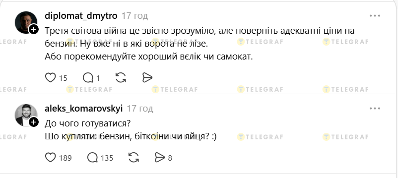 Не обійшлося і без жартів про дорожнечу бензину. Україні просять порекомендувати хороший велосипед чи самокат. Також питають, до чого готуватися та що купляти — бензин, біткойни чи яйця?