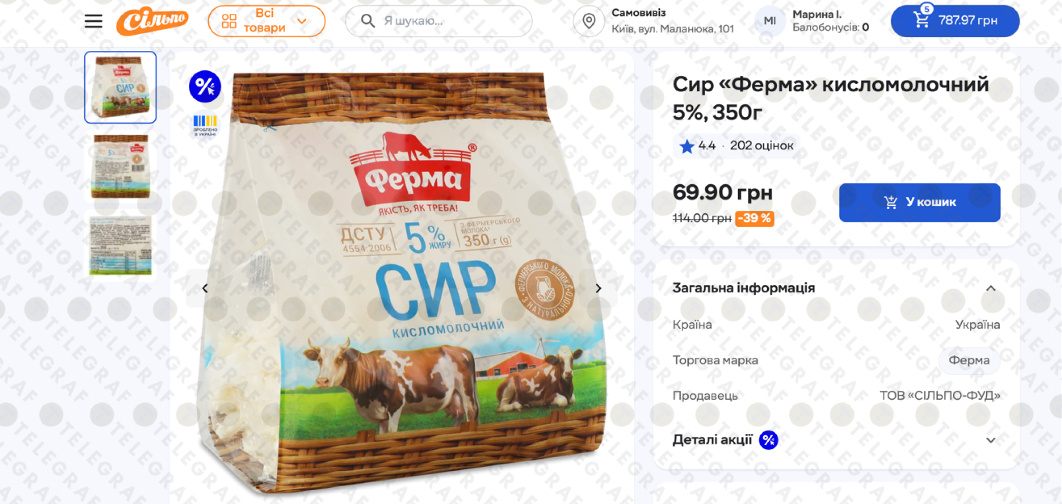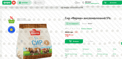 Станом на початок березня, справжній "цінопад" на цей товар зафіксовано в мережі "Сільпо". Тут сир "Ферма" 5% (350 г) пропонують за акційною ціною 69,90 грн. До знижки його вартість складала 114,00 грн, тож чиста економія становить 39%.