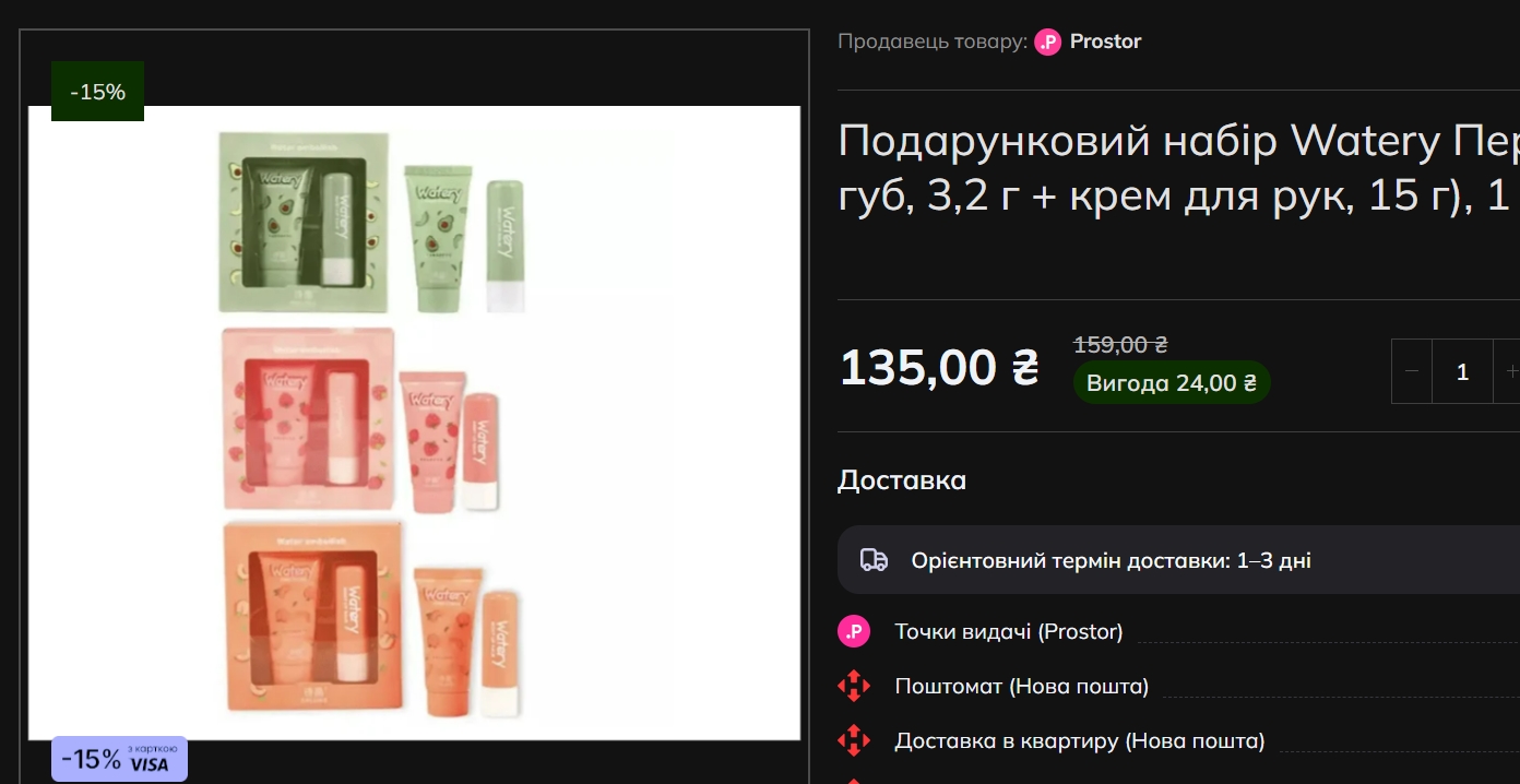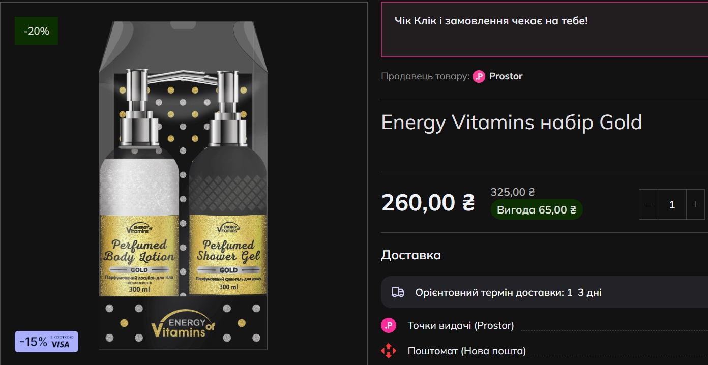 У Prostor до категорії тіла відносяться набори Energy Vitamins My Blue Stars (гель для душу + лосьон, 300+300 мл) за 263 гривні (-20%), Energy Vitamins Gold — 260 гривень (-20%), Oblepikha для тіла — 205 гривень (-14%), Delamark I Am Ukrainian (гель для душу + рідке мило, 500+500 мл) — 316 гривень (-25%).