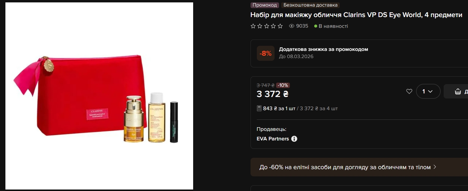 Найдорожчі та найпомітніші — набори Clarins. Набір для макіяжу очей VP DS Eye World із чотирьох предметів коштує 3 372 гривні (знижка 10%), набір Collection Regard із сироваткою, тушшю та засобом для демакіяжу — 3 238 гривень, Total Eye Lift — 3 012 гривень. Знижки тут символічні, але сам рівень продуктів відповідає ціні.