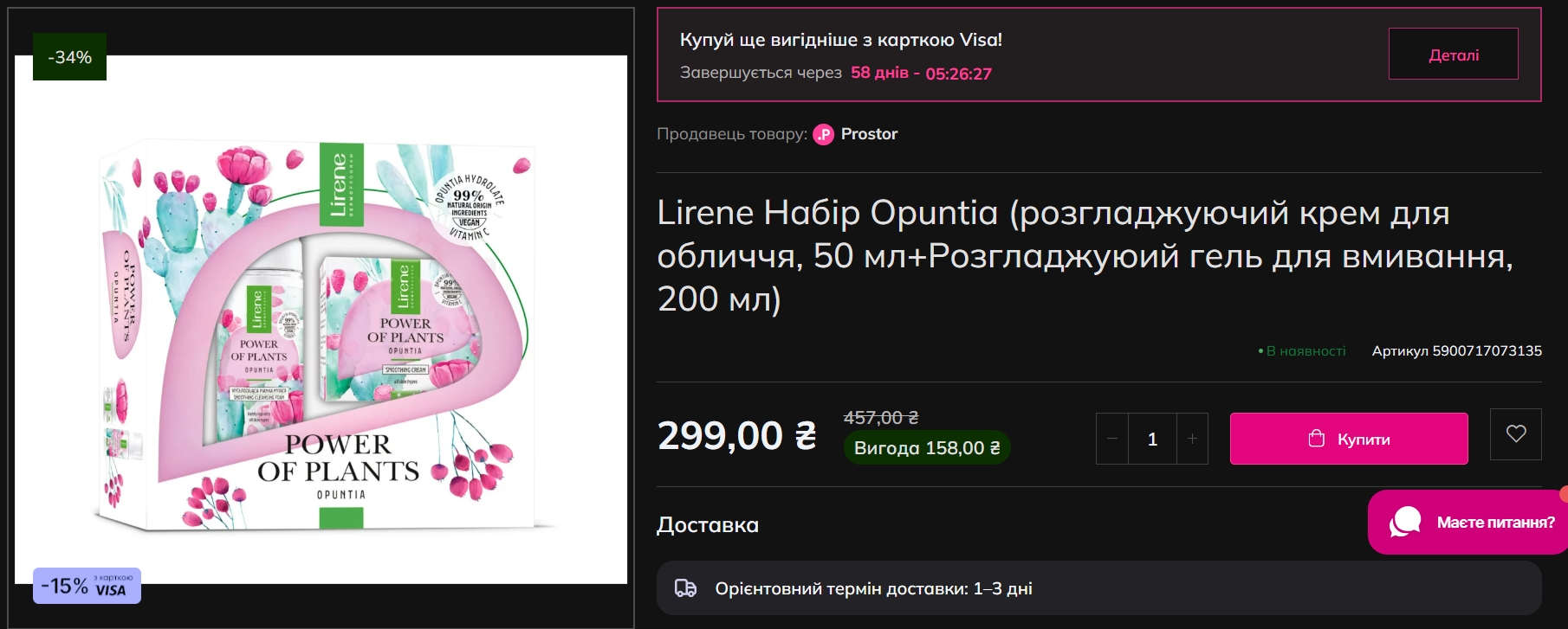 У Prostor з'явився набір Lirene Opuntia — крем і гель для вмивання за 299 гривень (знижка 34%).