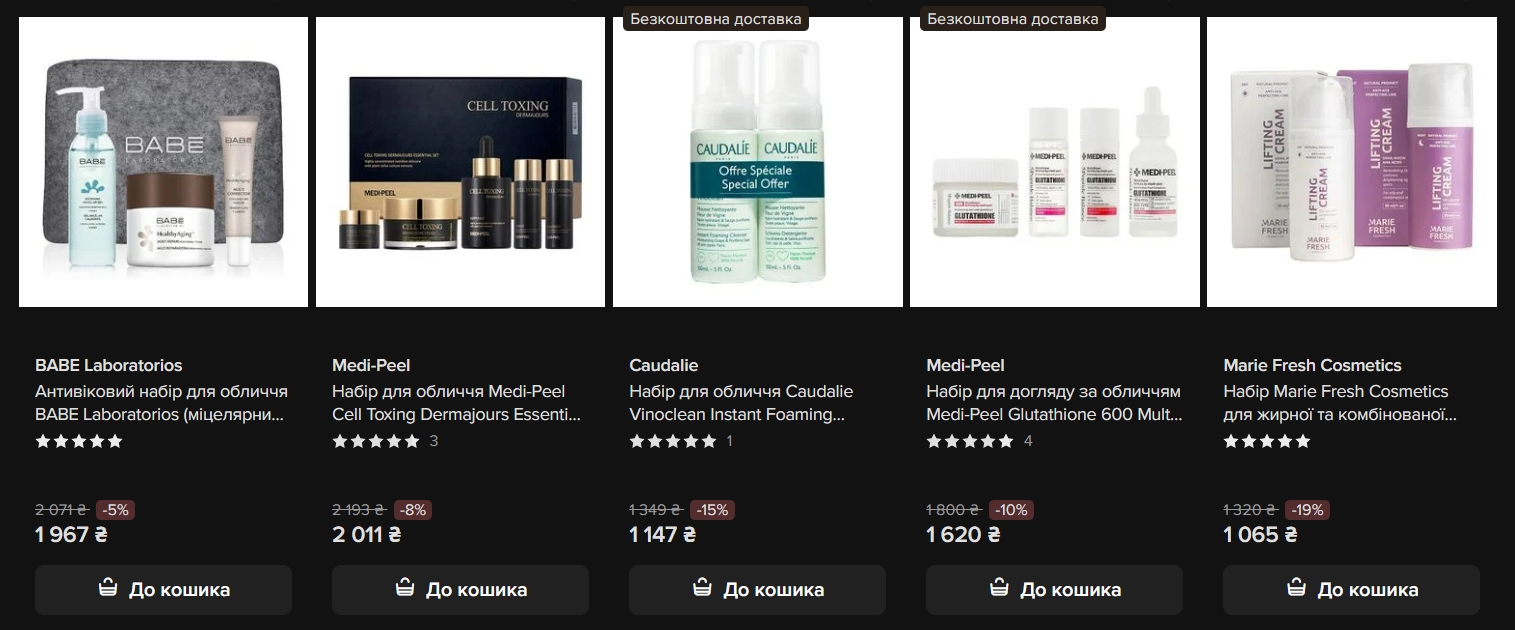 Набори для обличчя — другий великий розділ акцій. Тут представлені марки різного рівня: від елітної дерматокосметики до доступних корейських ліній.