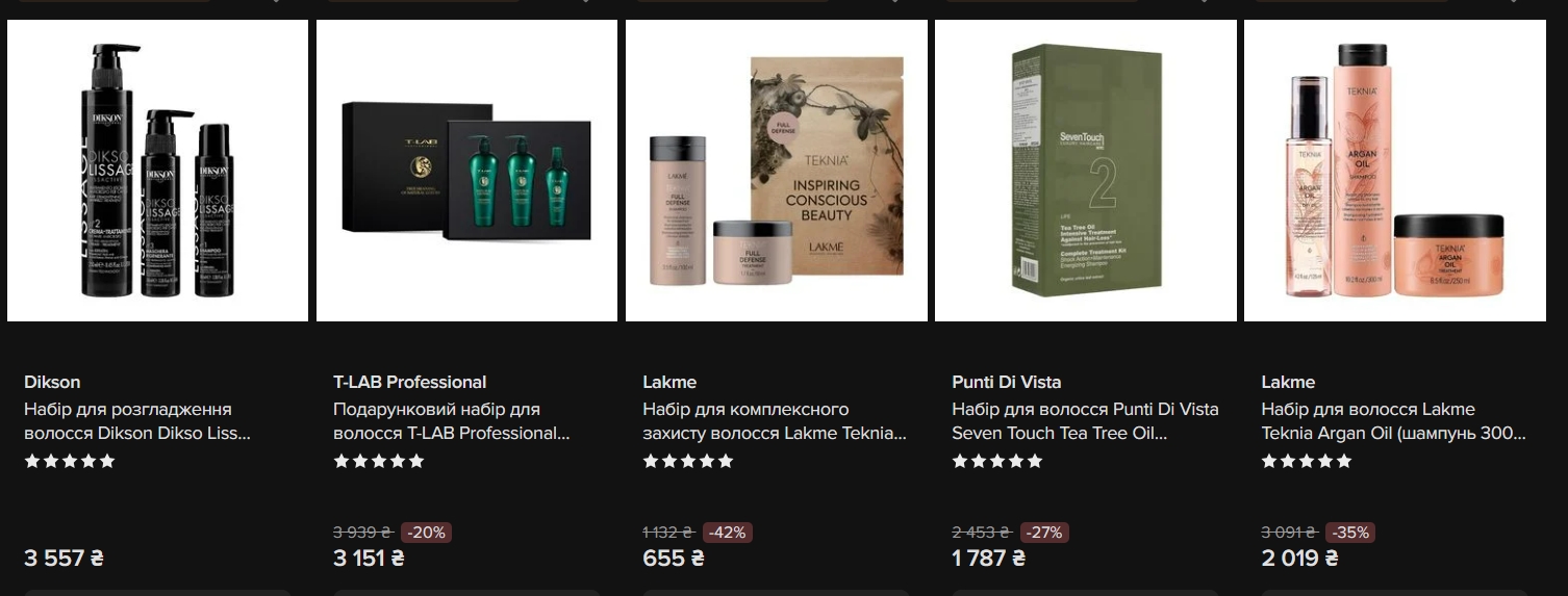 T-LAB Professional — один із найпомітніших брендів у цьому розділі. Набори серій Natural Lifting Ritual, Aura Oil Ritual, Total Protect Ritual, Organic Shape Ritual, Blond Ambition Ritual — всі зі знижкою 20%. Ціни — від 2 527 до 3 703 гривень. Є також набір Sapphire Energy + Total Protect із чотирьох предметів за 2 711 гривень.