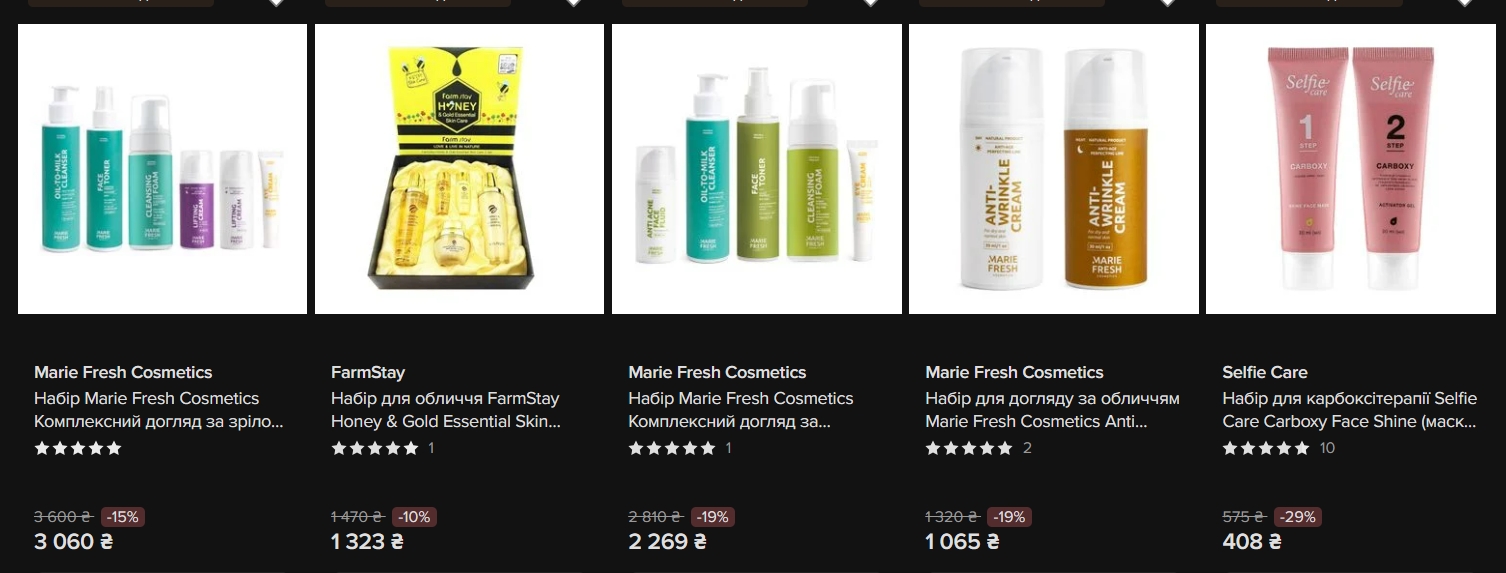 FarmStay пропонує корейські набори з гіалуроновою кислотою та колагеном за 1 155-1 350 гривень зі знижками 10-20%. Jigott Well-Being Greentea — набір із п'яти продуктів на основі зеленого чаю за 919 гривень. Fraijour з ретинолом та колагеном — 1 966 гривень (-24%).