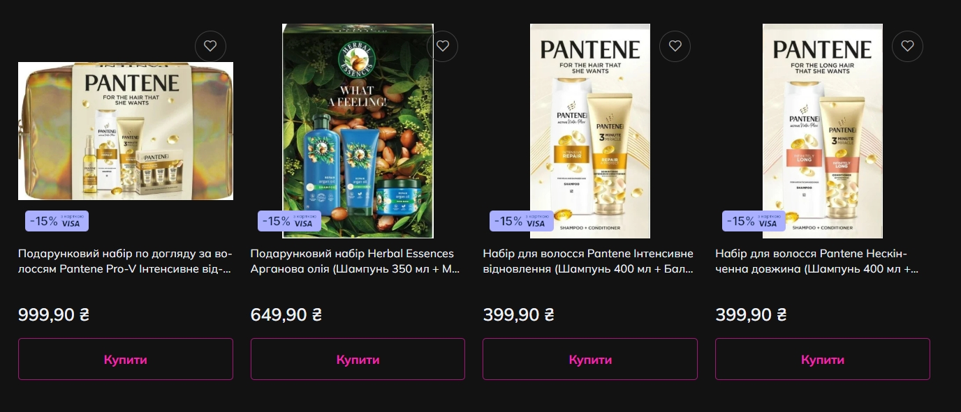 У Prostor представлені набори Pantene для інтенсивного відновлення та безкінечної довжини (шампунь + бальзам), Herbal Essences з аргановою олією (три продукти), Gliss Kur Oil Nutritive (шампунь + бальзам), а також набори JEM для різних типів волосся — кучерявого, фарбованого, сухого, пошкодженого. Знижки — від 20% до 30%.