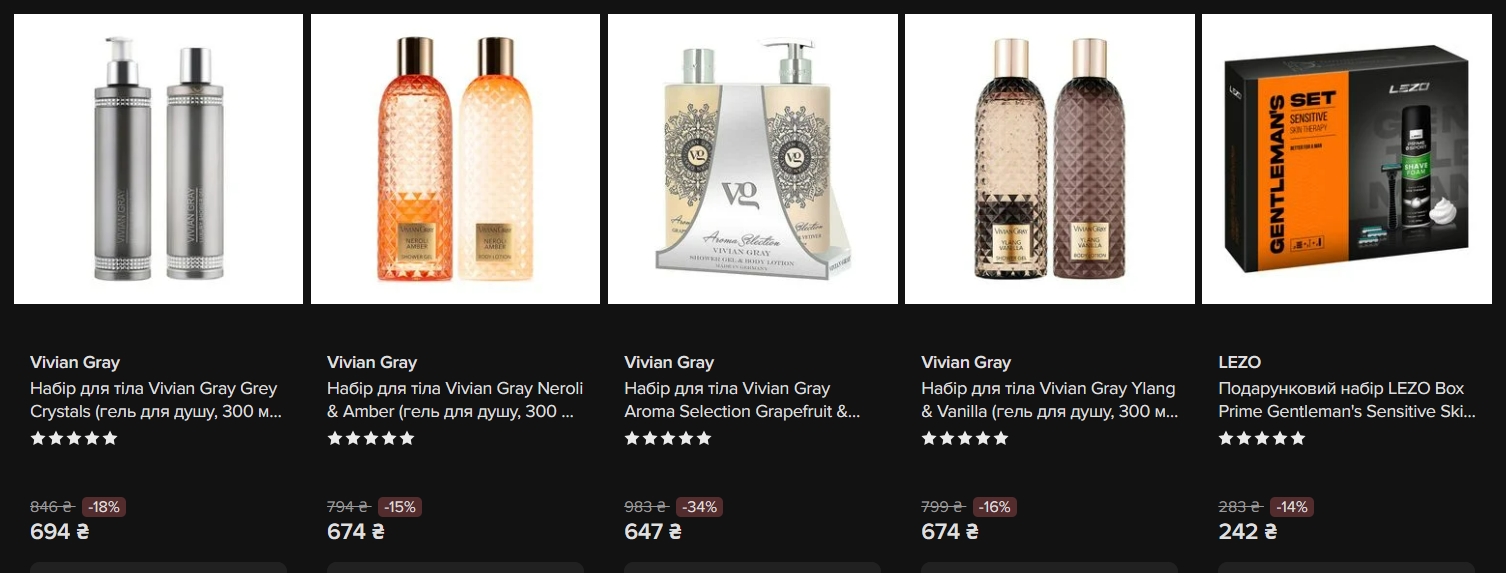 Vivian Gray — бренд, що представлений найширше в цій категорії на Eva. Є набори Brown Crystals, Grey Crystals, Neroli & Amber, Ylang & Vanilla, Jasmine & Patchouli, Lemon & Green Tea, Aroma Selection Amber & Cedar та Grapefruit & Vetiver. Знижки — від 15% до 35%. Ціни — від 427 до 694 гривень за набір із гелем і лосьйоном (по 250-500 мл).