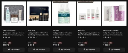 Medi-Peel представлений кількома варіантами: набір Cell Toxing Dermajours Essential Kit із п'яти продуктів — 2 011 гривень (-8%), набір Glutathione 600 Multi Care Kit — 1 620 гривень (-10%), набір Peptide 9 Skin Care Special Set із п'яти предметів — 2 975 гривень (-15%).