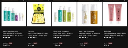 Marie Fresh Cosmetics — найбагатше представлений бренд у категорії. Він пропонує набори під різні типи шкіри: для жирної та комбінованої, для сухої та нормальної, для зрілої шкіри, для молодої та проблемної. Знижка на всі позиції — 15%. Ціни — від 1 122 до 3 060 гривень залежно від кількості продуктів у наборі. Є також окремий набір "Найкращій мамі" — пінка, тонік, денний і нічний крем за 1 481 гривню замість 2 469 (-40%).