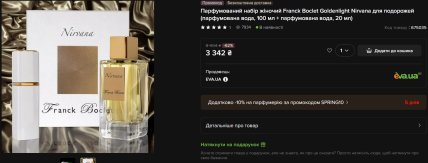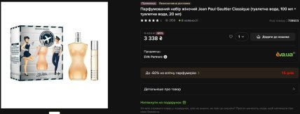 Серед найпомітніших пропозицій — Franck Boclet Goldenlight Nirvana зі знижкою 62%: набір із парфумованою водою 100 мл та мініатюрою 20 мл коштує 3 342 гривні замість 8 904. Не відстає і Jean Paul Gaultier Classique — туалетна вода 100 мл та мініатюра 20 мл за 3 338 гривень при початковій ціні 9 424. Знижка — 65%.
