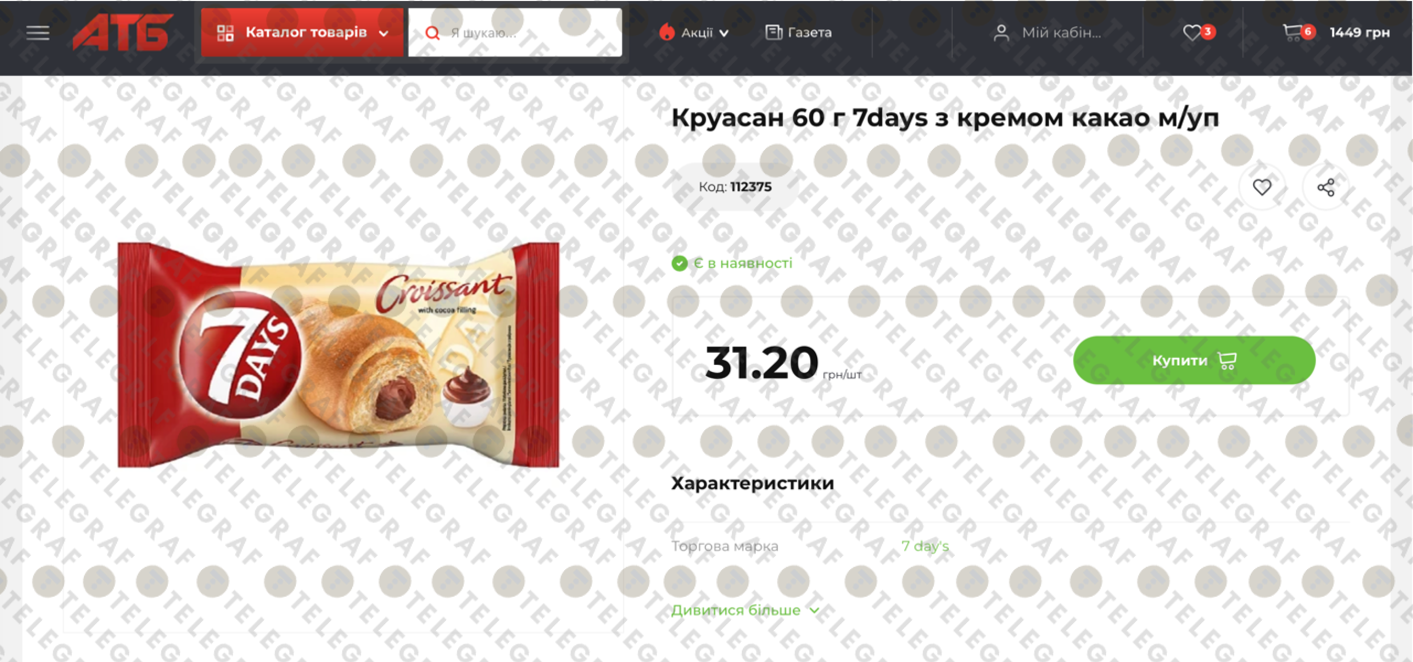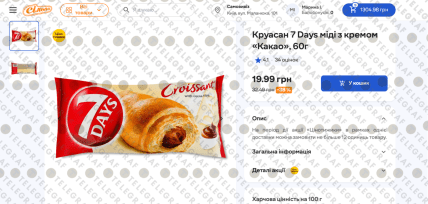 Найвищу ціну на цей товар станом на сьогодні зафіксовано в мережі "АТБ". Там за круасан 7 Days 60 г доведеться заплатити 31,20 грн. Жодних акційних пропозицій на цей товар у цій мережі на момент моніторингу не представлено.