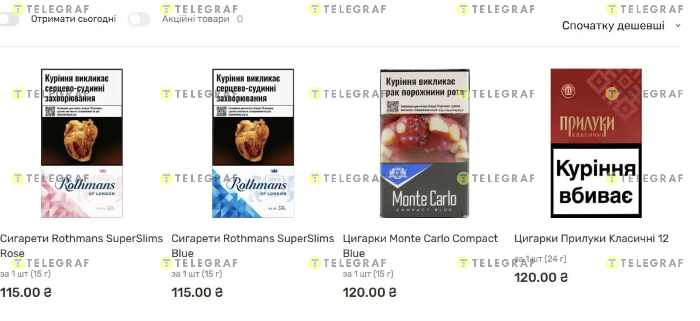 У магазинах "Варус" найдешевшими сигаретами є Rothmans SuperSlims коштує 110 грн, далі йдуть Monte Carlo — 120 грн, а Прилуки Класичні 12 — 120 грн за упаковку.