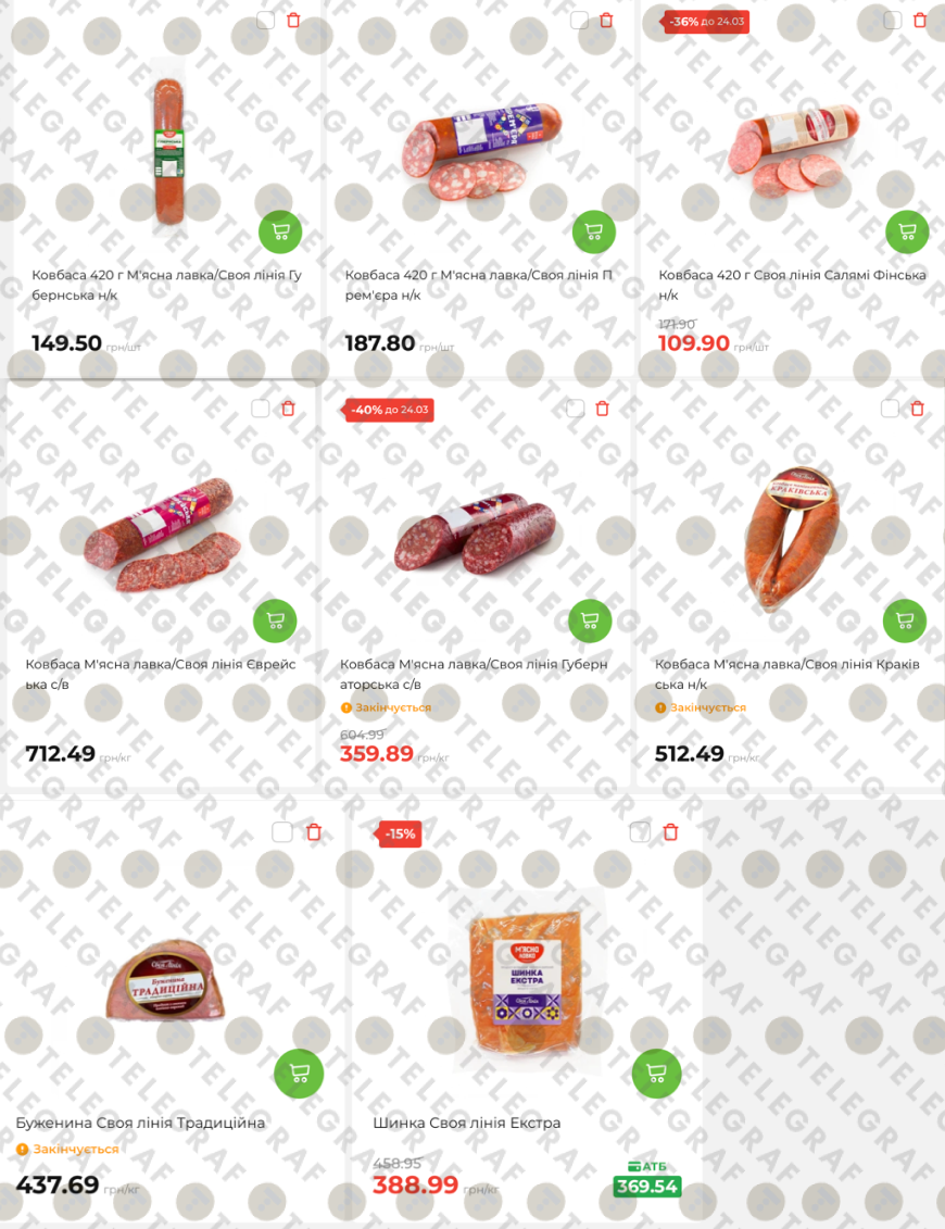 - Ковбаса: "Салямі Фінська" коштує близько 109,90 грн за 420 г, тоді як сирокопчені варіанти (наприклад, "Губернаторська") зі знижкою обійдуться у 359,89 грн за кг.