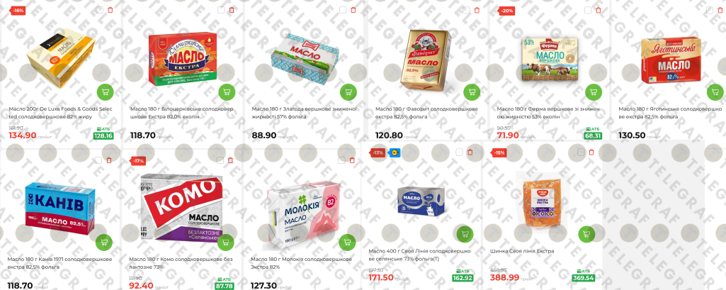 - Масло жирністю 82% ("Яготинське", "Ферма", "Молокія") коштує від 120,80 до 134,90 грн за пачку.