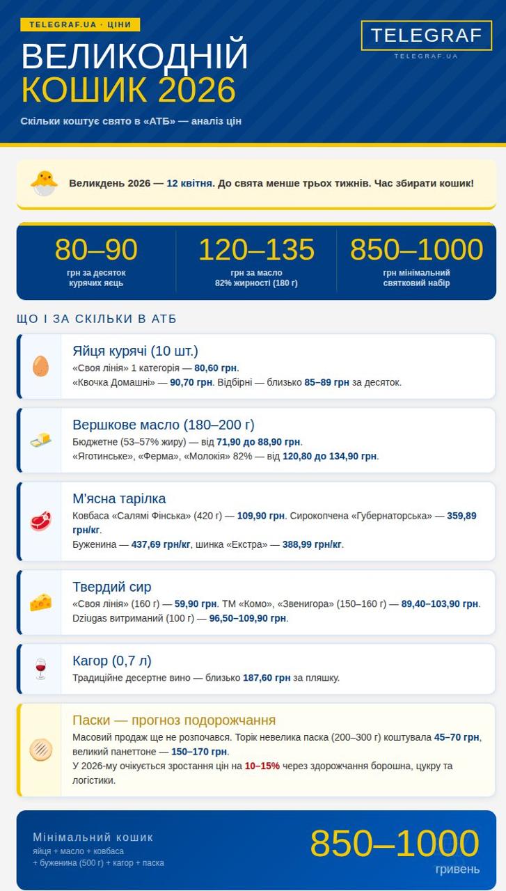 Якщо збирати мінімальний святковий набір (десяток яєць, пачка масла, палиця ковбаси, шматочок буженини (500 г), Кагор та середня паска), то цього року чек в АТБ складе приблизно 850–1000 гривень.