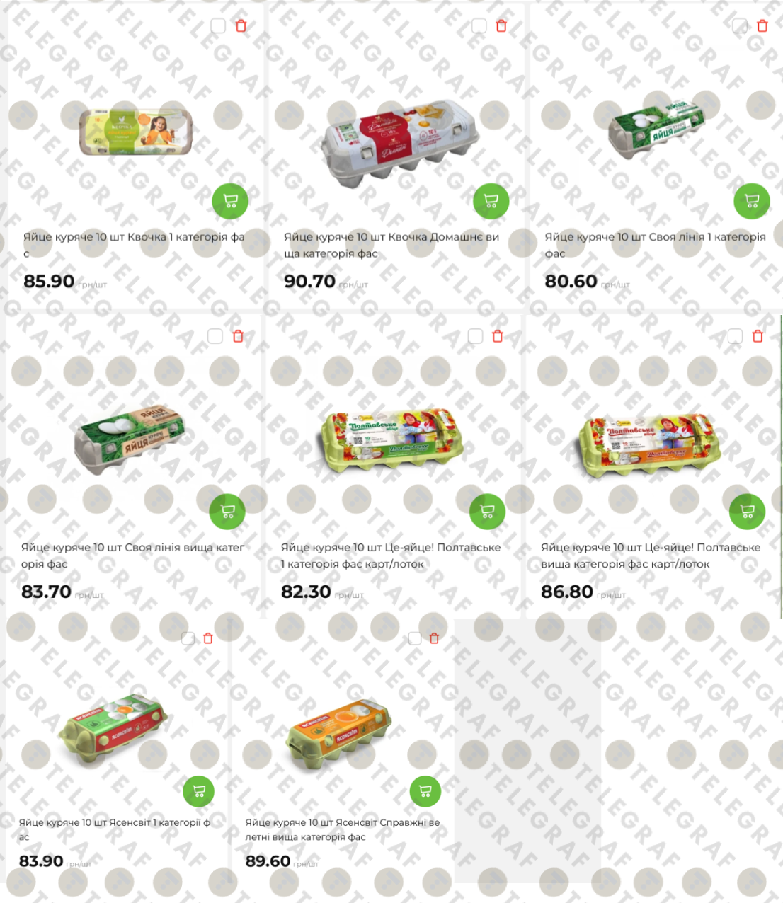 Ціни на курячі яйця (за 10 шт.) зараз коливаються від 80,60 грн (власна марка "Своя лінія", 1 категорія) до 90,70 грн ("Квочка Домашні"). Середня ціна за десяток відбірних яєць становить приблизно 85–89 грн.