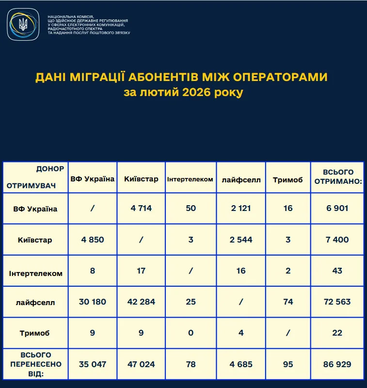 За даними Національної комісії (НКЕК), у лютому 2026 року майже 87 тисяч абонентів скористалися послугою перенесення номера (MNP). "Телеграф" продовжує стежити за ситуацією на ринку мобільного зв’язку. У лютому ми розповідали про підвищення тарифів і прогнозували хвилю переходів, а зараз маємо перші підсумки: українці дійсно переносять номери до одного оператора, поки інші два гіганти втрачають клієнтів.