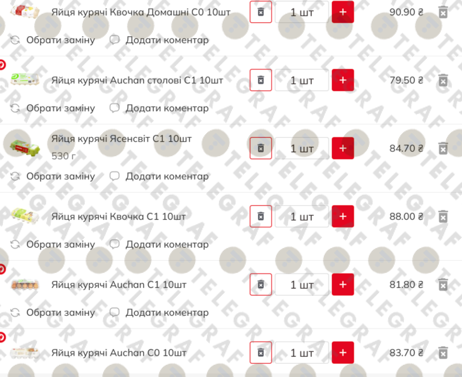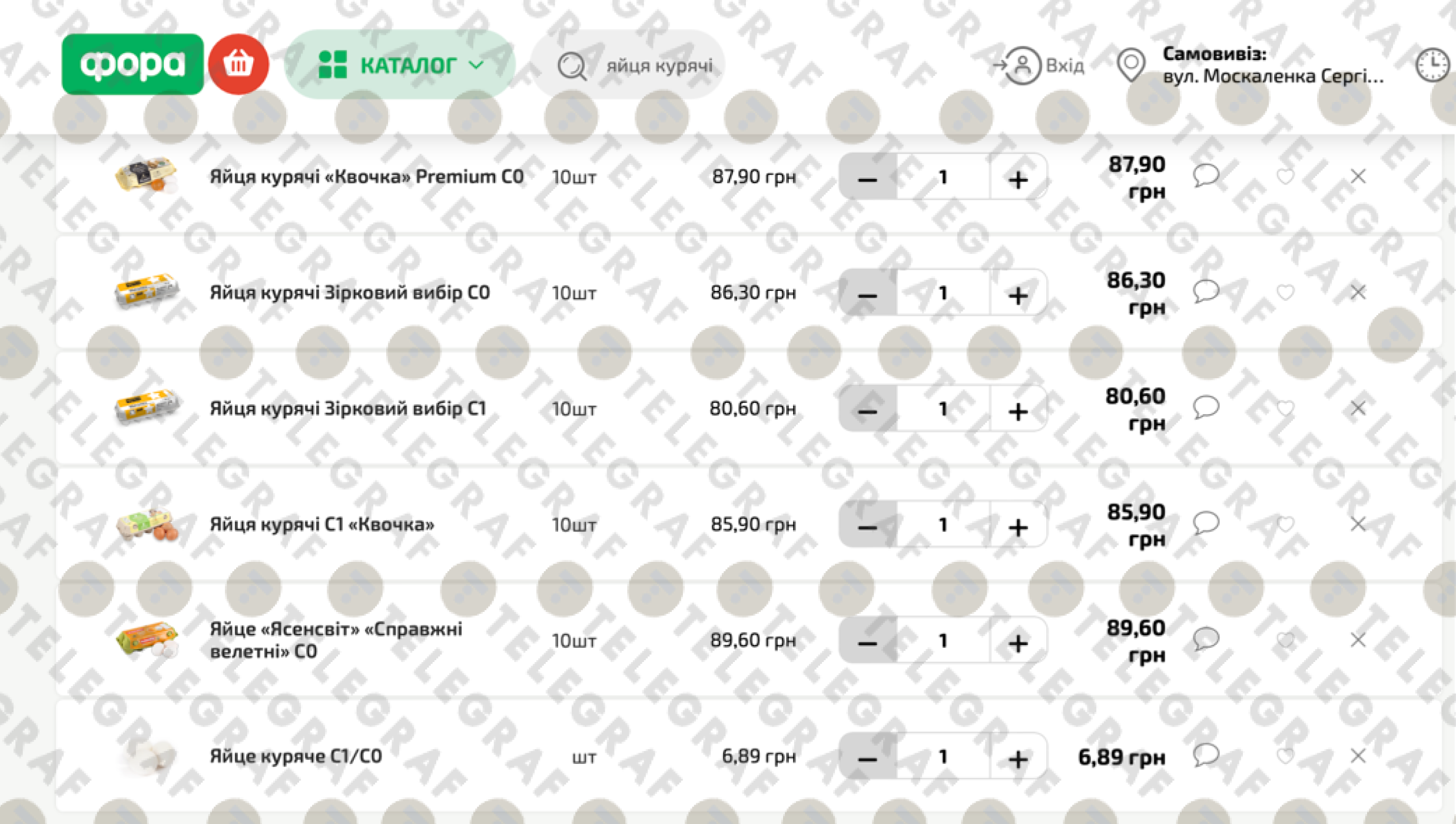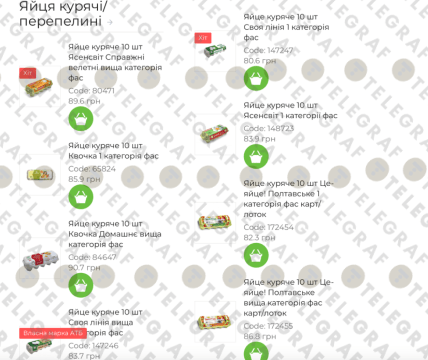 - Яйце С1/С0 (поштучно) — 6,89 грн за шт (68,90 грн за десяток)
