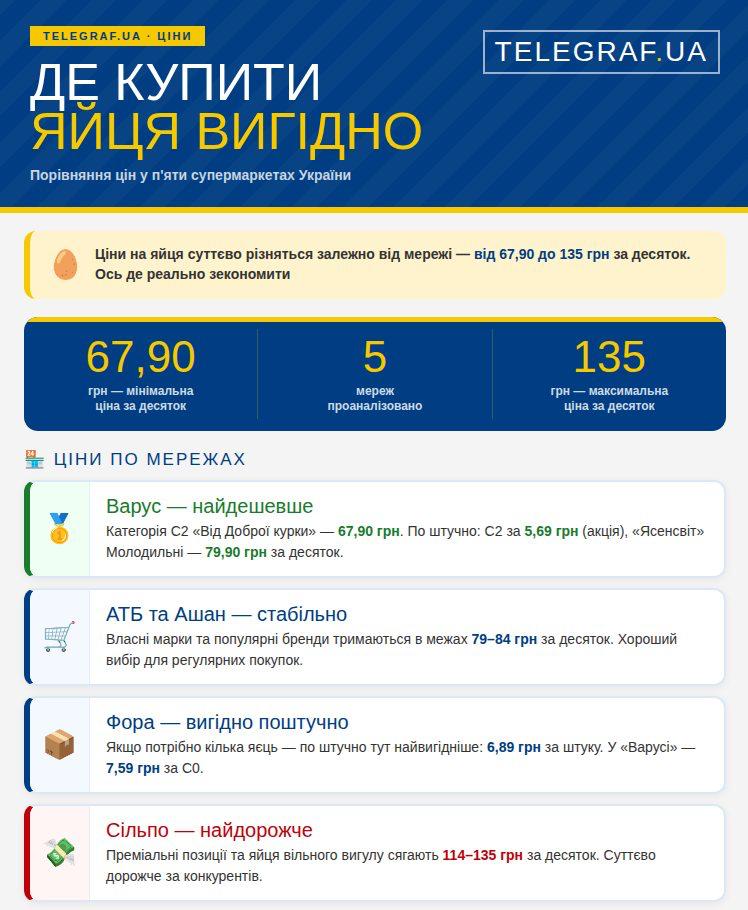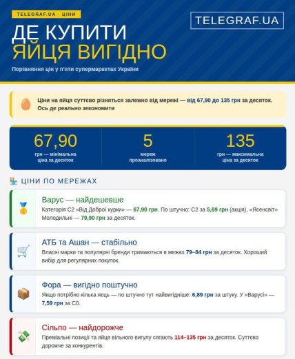 - Найнижчу ціну на фасовані яйця пропонує "Варус" — категорія С2 від марки "Від Доброї курки" коштує 67,90 грн. Також у цій мережі діють тимчасові акційні пропозиції на поштучні яйця С2 (5,69 грн) та "Ясенсвіт" Молодильні (79,90 грн).