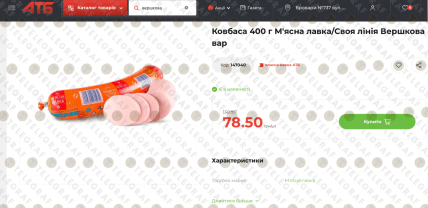 • варена ковбаса "Вершкова" (400 г) — нова ціна 78,50 грн (замість 130,90 грн);