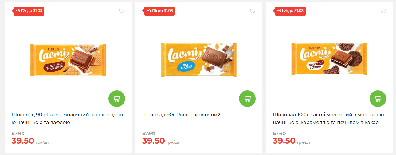 У продажу є акційні пропозиції на шоколад Roshen Lacmi. Плитки вагою 85-100 грамів із різними смаками — з карамеллю, горіхами, вафлями чи полуничною начинкою — продаються зі знижкою 41%.