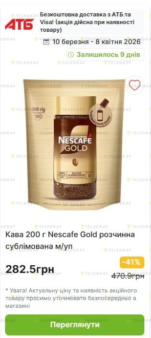 За даними ресурсу "GoToShop", акційна пропозиція діє на популярну розчинну каву Nescafe Gold. Знижка становить 41% і поширюється на упаковку 200 грамів. Придбати товар за вигідною ціною можна до 8 квітня 2026 року включно.