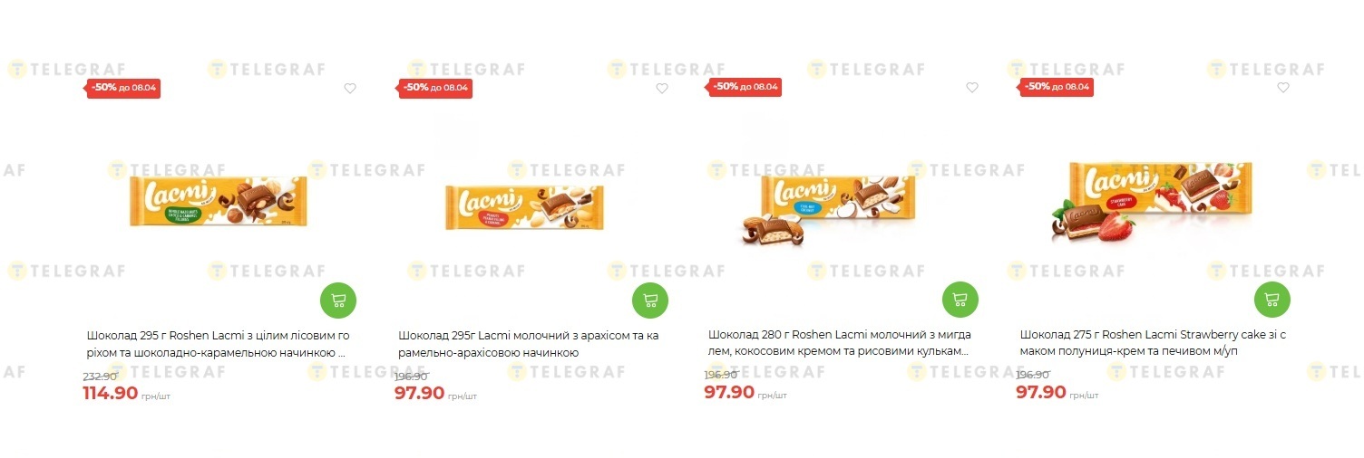 - Шоколад 295 г "Roshen" Lacmi з цілим лісовим горіхом та шоколадно-карамельною начинкою — 114,90 грн замість 232,90 грн (економія 118 грн)