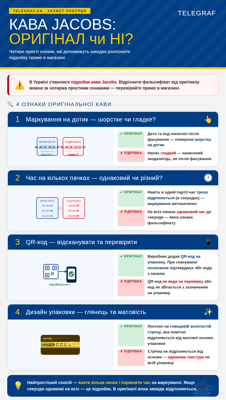 В Україні споживачів попереджають про можливу появу підробок популярної кави "Jacobs". Відрізнити оригінальний продукт від фальсифікату можна за кількома простими ознаками.
