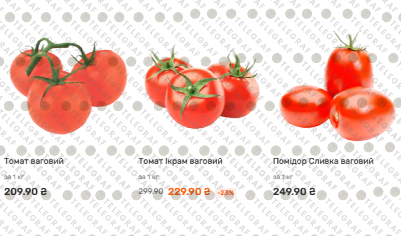 • Томат Ікрам ваговий: 229.90 грн/кг (зі знижкою -23%, стара ціна — 299.90 грн).