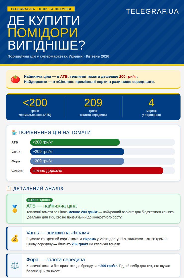 Аналіз цін показує, що для економного наповнення продуктового кошика найкращим варіантом залишається "АТБ", де звичайні тепличні томати пропонують за найнижчою ціною — менш як 200 гривень за кілограм. Якщо ж ви шукаєте конкретні сорти, як-от "Ікрам", то варто завітати до "Varus", оскільки завдяки поточним знижкам там можна суттєво зекономити.