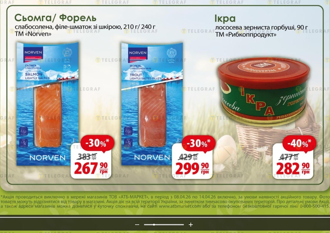 У супермаркетах "АТБ" з 8 квітня почали діяти нові знижки на морепродукти. У межах акційної пропозиції ціни на популярні позиції помітно знизилися, що зробило їх доступнішими перед Великоднем.