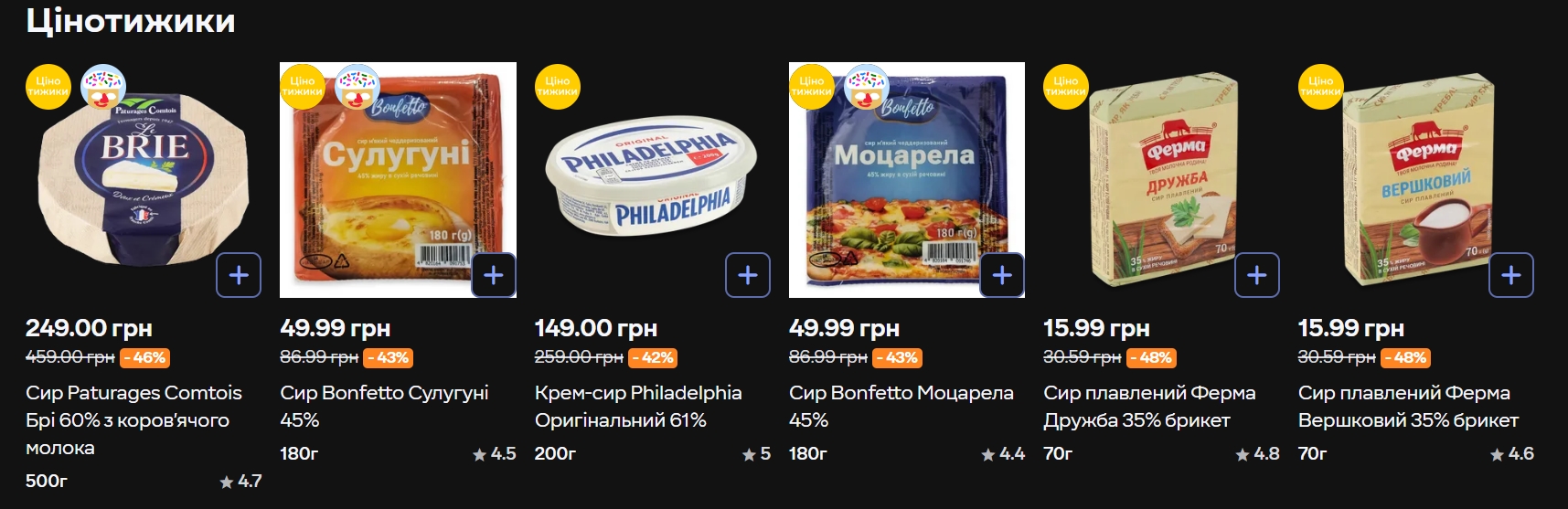 Молочний відділ і сири — одна з найбагатших категорій поточної акції. Найпомітніша позиція — сир Paturages Comtois Брі 60% (500 г): він подешевшав з 459 до 249 гривень, тобто -46%. Для порівняння, крем-сир Philadelphia Оригінальний (200 г) коштує 149 грн замість 259 (-42%).