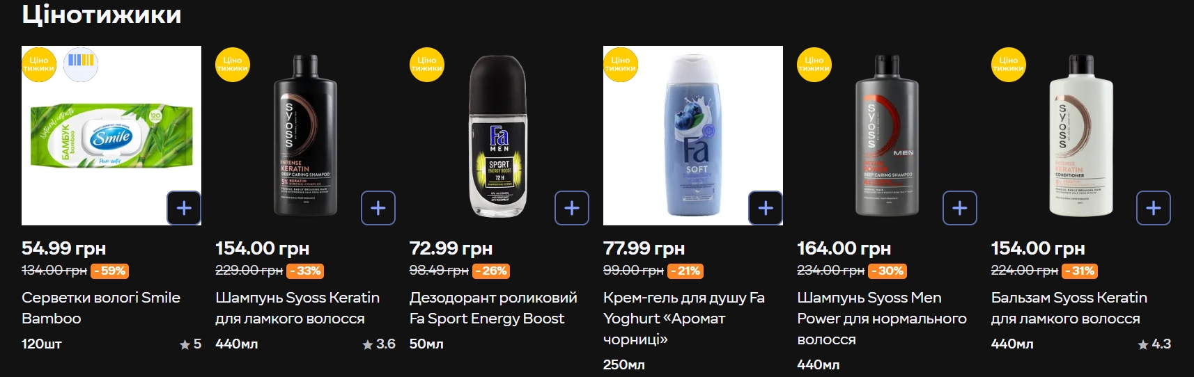 Із засобів для волосся зі знижкою продаються шампунь Syoss Keratin (440 мл) — 154 грн замість 229 (-33%), шампунь Schauma Fresh (400 мл) — 89,99 грн замість 139 (-35%), бальзам Syoss Keratin (440 мл) — 154 грн замість 224 (-31%).