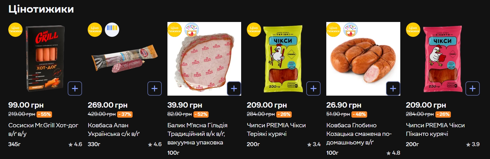 Балик М'ясна Гільдія Традиційний у вакуумній упаковці подешевшав на 52% — зі 82,90 до 39,90 гривень за 100 г. Ковбаса Алан Українська с/к в/ґ (330 г) коштує 269 гривень замість 429, знижка — 37%.
