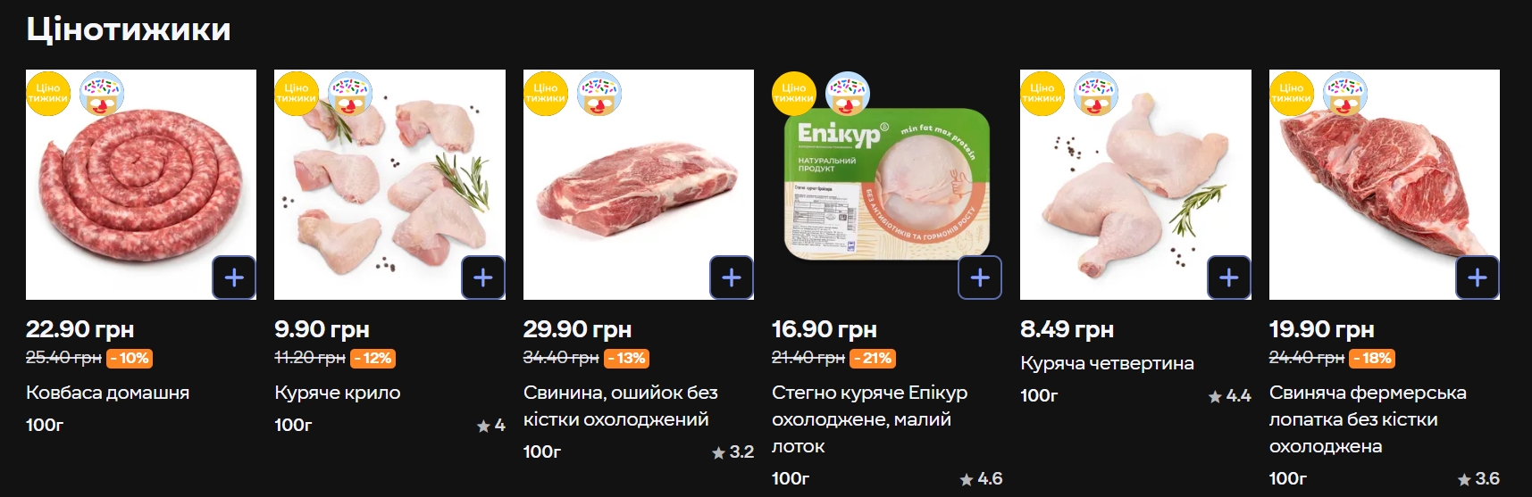 З охолодженого м'яса під акцію потрапили куряче стегно Епікур (21,40 → 16,90 грн/100 г, -21%), свинина ошийок без кістки (34,40 → 29,90 грн/100 г, -13%) та свиняча фермерська лопатка (24,40 → 19,90 грн/100 г, -18%). Куряче крило пропонують по 9,90 грн/100 г замість 11,20 грн.