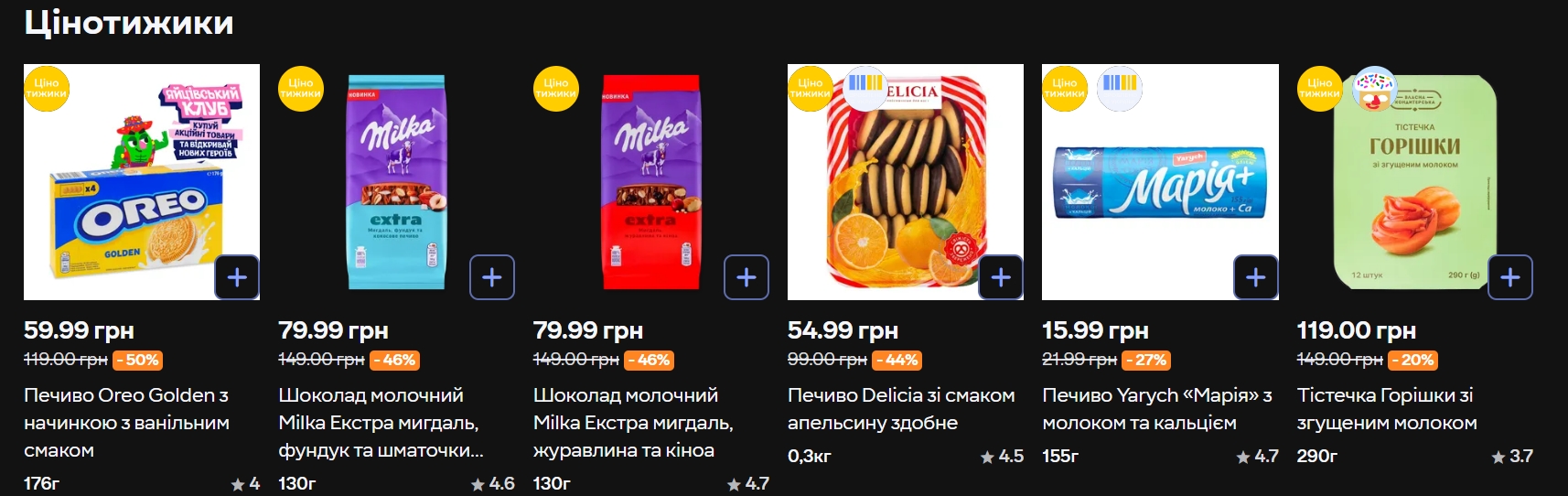 Із солодощів: шоколад Milka Екстра (130 г) — 79,99 грн замість 149 (-46%), печиво Oreo Golden (176 г) — 59,99 грн замість 119 (-50%), журавлина Roni сушена (150 г) — 74,99 грн замість 154 (-51%).