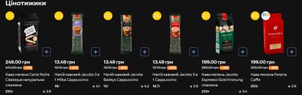 Кава мелена Carte Noire Classique (250 г) продається за 249 грн замість 474 (-47%). Напої кавові Jacobs 3 в 1 (різні смаки) — 13,49 грн замість 19,19 (-30%). Сік Galicia томатний (1 л) — 59,99 грн замість 89,99 (-33%), сік Galicia мультифруктовий (1 л) — 59,99 грн замість 94,99 (-37%).