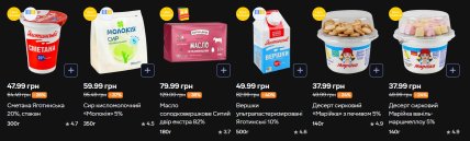 Серед кисломолочних продуктів знижено ціни на сир кисломолочний "Молокія" 5% (350 г) — 59,99 грн замість 95,49 (-37%), вершки Яготинські 10% (500 г) — 49,99 грн замість 82,99 (-40%) та вершки "Бурьонка" 15% (200 г) — 29,99 грн замість 49,99 (-40%).