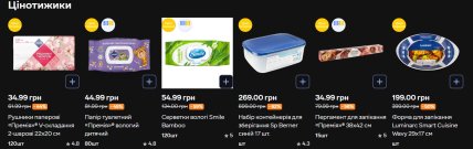 З посуду та господарських товарів виділяється набір контейнерів Sp Berner синій, 17 шт. — 269 грн замість 699. Це найбільша знижка у всій акції — 62%. Також під акцію потрапила форма для запікання Luminarc Smart Cuisine Wavy 29×17 см — 199 грн замість 399 (-50%) і пергамент для запікання "Премія"® (15 шт) — 34,99 грн замість 79,99 (-56%).