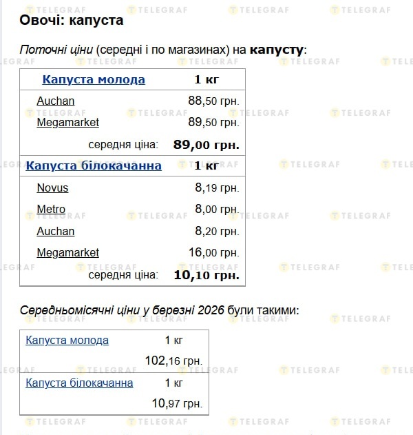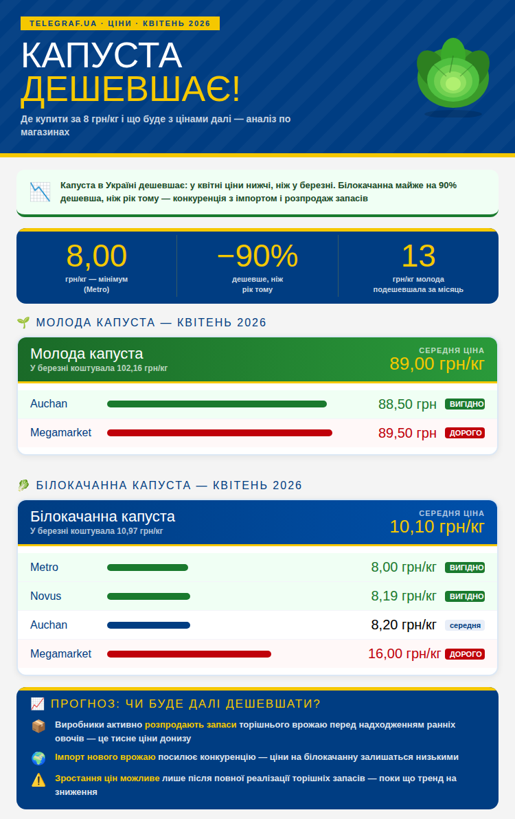 Водночас білокачанна капуста наразі значно дешевша: середня квітнева ціна становить 10,10 грн/кг (Novus — 8,19 грн/кг, Metro — 8,00 грн/кг, Auchan — 8,20 грн/кг, Megamarket — 16,00 грн/кг), тоді як у березні вона коштувала 10,97 грн/кг. Різниця склала 0,87 грн/кг у бік зниження.