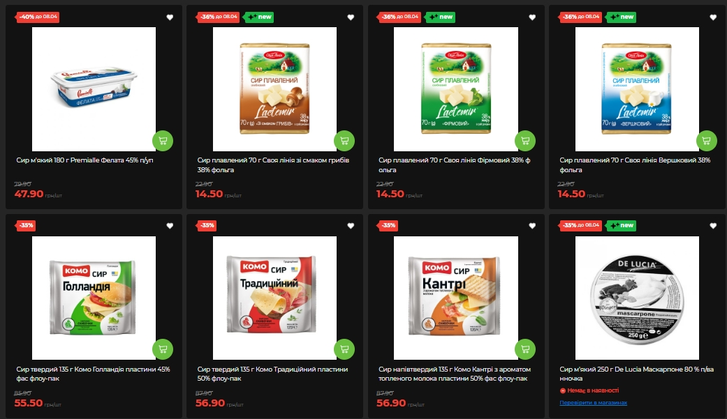 Водночас крем-сир Philadelphia (125 г) подешевшав на 30% і коштує 90,90 грн замість 129,90 грн. Сир Dziugas (180 г) — 139,90 грн замість 199,90 грн (-30%). Сири Ryki (135 г) продаються по 61,90 грн замість 88,90 грн (-30%).