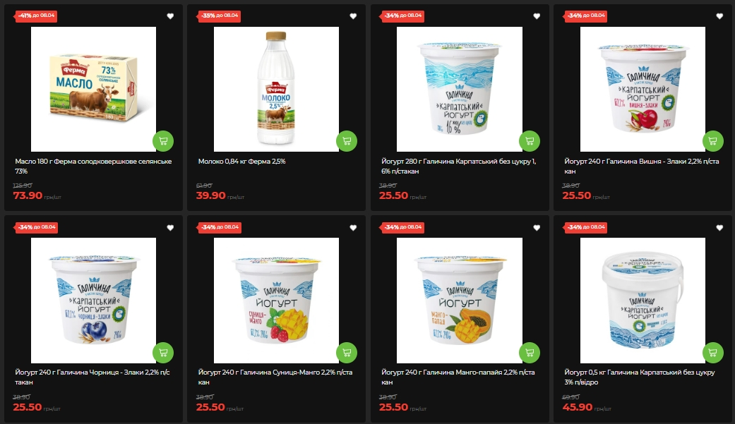 Серед інших вигідних пропозицій — йогурти "Галичина" зі знижкою 34% по 25,50 грн замість 38,90 грн, а також сметана "ПростоНаше" (300 г, 15%) — 36,50 грн замість 52,90 грн (-31%). Акція діє лише до 14 квітня, тож покупці мають змогу поповнити холодильник улюбленими продуктами за зниженими цінами.