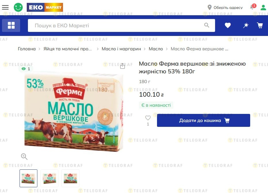 Журналісти "Телеграфу" порівняли вартість вершкового масла "Ферма" зі зниженою жирністю 53% (180 г) у трьох популярних торгівельних мережах — "АТБ", Fozzyshop та "ЕкоМаркет". Аналіз показав суттєву різницю в цінах.